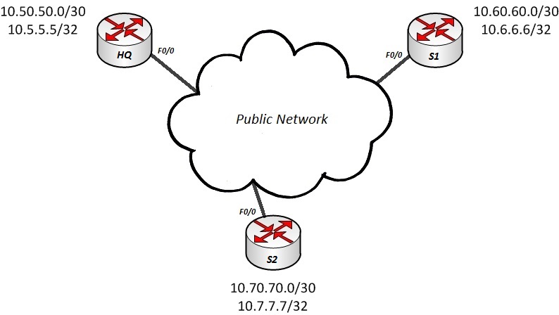 I have preconfigured EIGRP on all router interfaces (Hub-HQ, S1 and S2) except on the interfaces connecting to Public Network, but of course they still can’t advertise each other their networks because we still didnt create the mGRE tunnels.