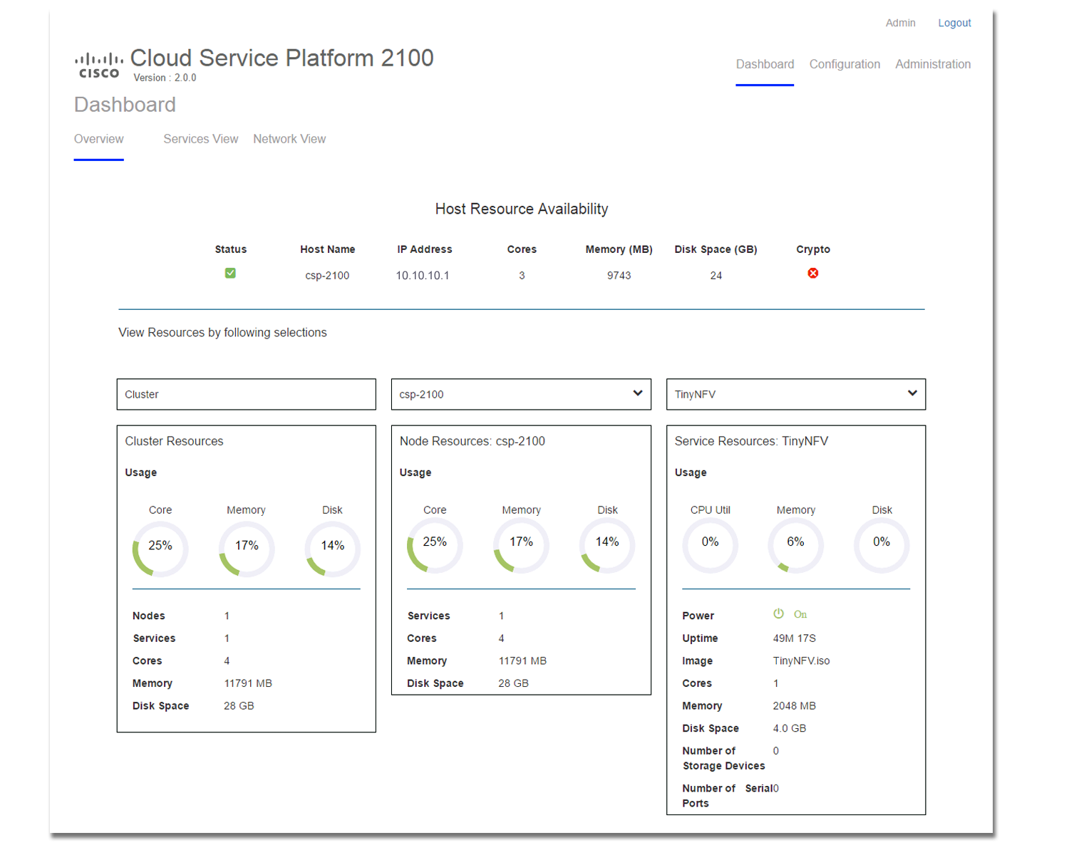 - Overview; Here we can see information’s regarding the Status and Resources available by the host (or cluster) where CSP-2100 is running on (such as, HostName, IPaddress, CPU, RAM, Disk Space, and Crypto).