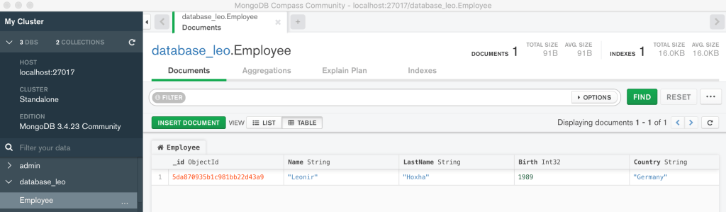 As a result, if we execute this python code, the database table, and employee data will be visible. There is many ways to check this, and I do it with a GUI application, called MongoDB Compass which is quite convenient to browse databases and different tables. The picture below is an output from MongoDB Compass, and it shows exactly the Database named ‘database_leo’, table ‘Employee’, and the employee data as described in this post.