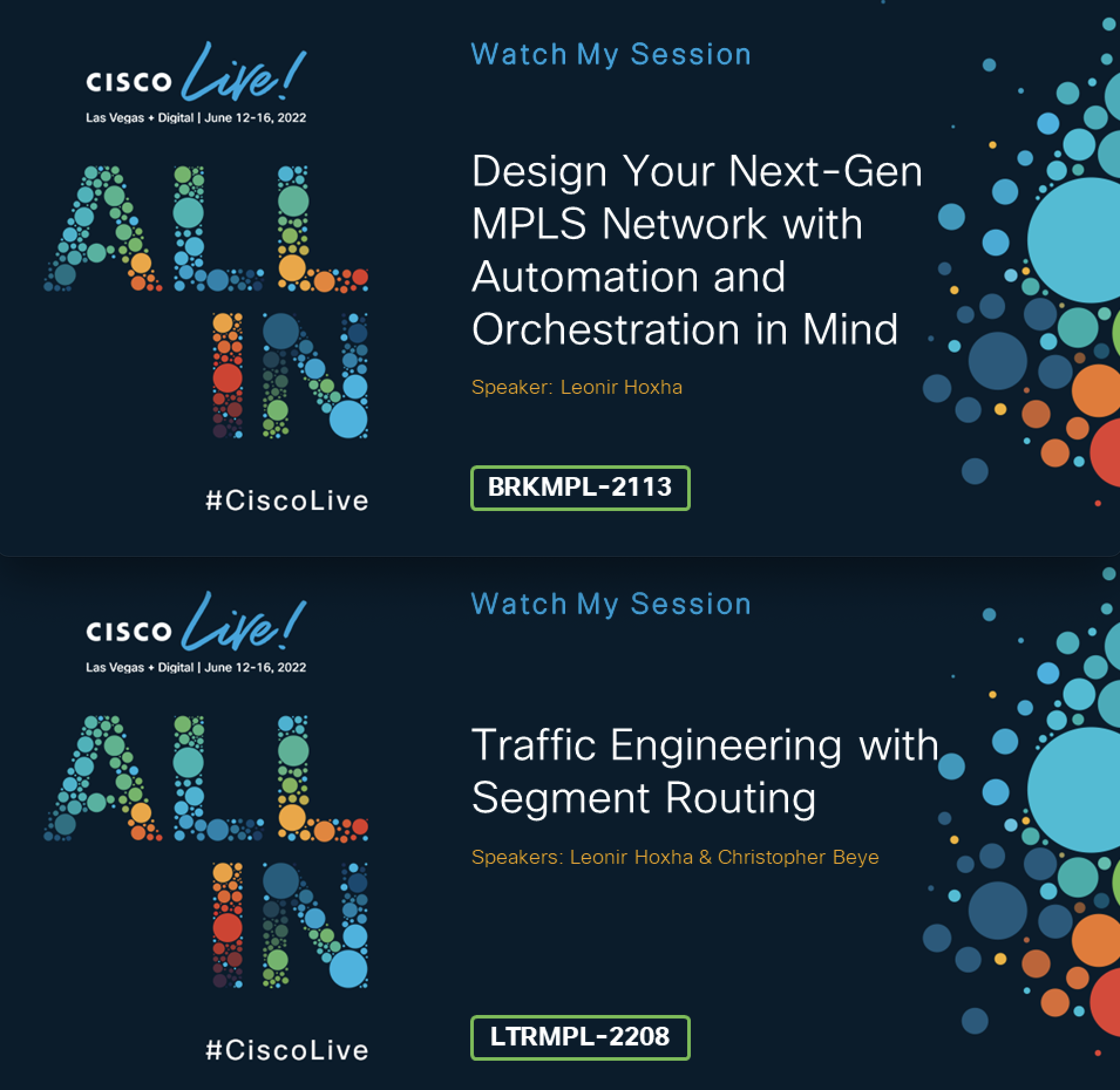 Long story short, this time at CLUS I’ll be speaking at a Breakout Session, talking about MPLS Design Best Practices with a bit of automation & orchestration nuances. I do as well have to deliver another session, an Instructor Led Lab session, this one focusing on Segment Routing Traffic Engineering.
