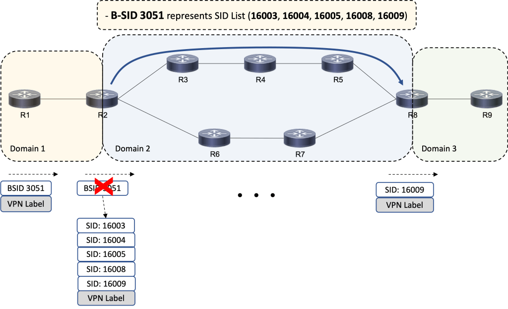 B-SID is also useful for isolating irregularities between different network domains. That means any link or node failure in a domain might re-advertise a different SID (label); however, the source PE which uses a B-SID of another domain, doesn’t have to react to that change, as the B-SID stays the same for the source PE, it’s only the ABR which advertises that B-SID the one that needs to perform the necessary changes in terms of refreshing the label-stack mapped to that specific B-SID.
